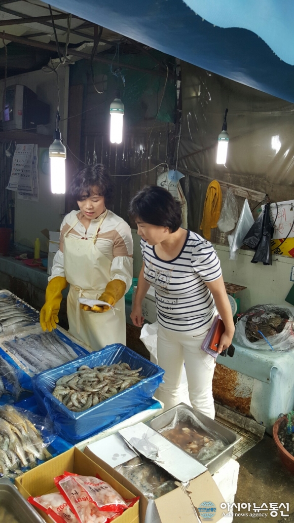 13일 인천시 계양구 작전재래시장에서 생선을 사고 있는 김경옥 계양구의회 운영위원장(오른쪽)의 모습./아시아뉴스통신=김선근 기자 추석을 앞둔 13일 김경옥 인천시계양구의회운영위원장(더민주당)이 인천계양구 작전시장을 찾아 계양구 재래시장의 ... 2016-09-14