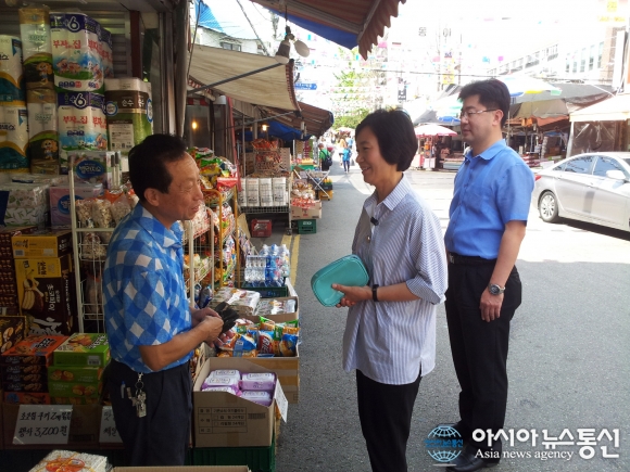 13일 인천시 계양구 작전재래시장에서 과일가게 사장에게 어려운 상황을 청취하는 조계자 인천시의회 의원(가운데)과 이도형 국민의당 디지탈소통 위원장(오른쪽)의 모습./아시아뉴스통신=김선근 기자 추석 명절을 앞둔 13일 이도형 국민의당 디지털소... 2016-09-14
