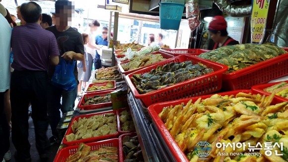14일, 추석을 하루앞두고 사람들이 추석음식 장만을 위해 서울 마포 공덕시장에서 장을 보고 있는 모습. 각종 튀김과 전을 구매하는 사람들로 북적였다./아시아뉴스통신=곽정일 기자 2016-09-14