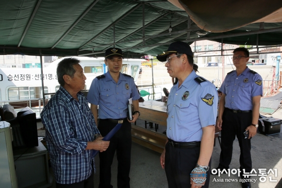 14일 송일종 인천해경서장(가운데)이 추석연휴 기간 귀성객과 행락객이 몰리는 관내 유?도선장을 비롯한 주요 선착장을 방문해 안전관리 실태를 직접 점검하고 있다.(사진제공=인천해양경비안전서) 송일종 인천해경서장이 13일과 14일 양일간 추석연휴 기... 2016-09-14