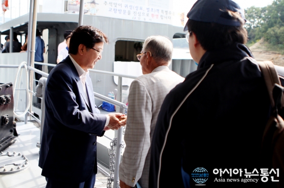 14일 권영세 안동시장이 안동·임하호를 찾아 성묘객들과 인사를 나누고 있다.(사진제공=안동시청) 권영세 안동시장이 추석연휴 첫째날인 14일 오전 안동·임하호수운관리사무소에서 추석맞이 수몰민 관공선 특별수송 운영에 따른 현장을 찾아 ... 2016-09-14