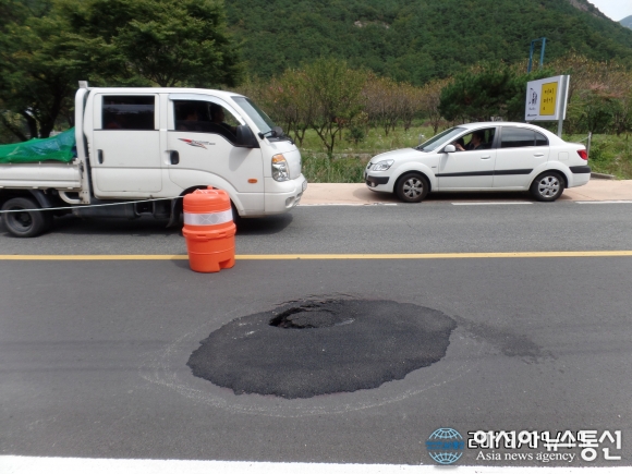 14일 경북 청도군 운문면 신원리 국지도 69호선 울산방면 500m지점에서 도로가 함몰하는 사고가 발생해 차량이 한쪽차선을 이용해 어렵게 교행하고 있다./아시아뉴스통신=염순천 기자 경북 청도군 운문면 신원리. 국지도 69호선 울산방면 500m지점에서 14일 ... 2016-09-14