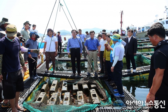 지난달 20일 이낙연 전남지사와 신우철 완도군수가 전복폐사 피해를 입은 완도군 금일해상 가두리양식장을 찾아 현황을 살피고 있다./아시아뉴스통신DB 전남도는 남해수산연구소가 지난 달까지 집단 폐사한 완도 전복 피해 원인을 적조 및 고수... 2016-09-14