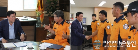 최경환 의원이 13일 경산소방서를 방문, 추석 연휴 대비 특별경계근무 중인 소방공무원들의 노고를 격려하고 있다.(사진제공=경산소방서) 최경환 국회의원(새누리당, 경북 경산)은 13일 경산소방서를 방문, 추석 연휴 대비 특별경계근무 중인 소방공무원... 2016-09-14