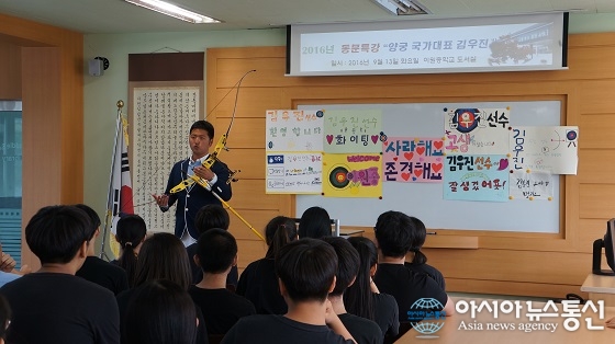 13일 리우올림픽 양궁 금메달리스트 김우진 선수가 추석명절을 맞아 모교인 충북 옥천 이원중학교를 방문해 특강을 진행하고 있다.(사진제공=옥천교육지원청) 리우올림픽 양궁 금메달리스트 김우진 선수가 추석명절을 맞아 모교인 충북 옥천 이원중학교... 2016-09-14