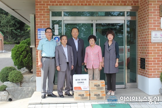 13일 충북 옥천교육지원청 봉사동아리인 심(心)봉사를 대표해 류웅렬 옥천교육장 등이 옥천군 옥천읍 영실애육원을 방문해 생필품을 전달한 뒤 기념촬영했다. 왼쪽부터 옥천교육지원청 지길영 총무담당, 유보현 행정지원과장, 류웅렬 교육장, 김경자 영실애육원장, 김... 2016-09-14