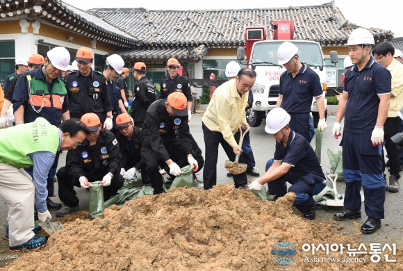 16일 김관용 지사, 최양식 경주시장이 지진피해 현장에서 복구용 모래를 담고 있다.(사진제공=경주시청) 9.12 지진 피해복구를 위해 민관군경 2400여명이 추석 연휴를 반납하고 현장복구에 구슬땀을 흘렸다. 16일 김관용 경북지사, 최양식 경주시장, 김석... 2016-09-16
