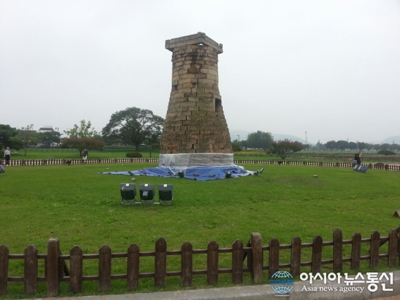 16일 경북 경주시가 제16호 태풍 '말라카스' 북상에 따라 문화재 피해를 최소화하기 위해 첨성대 기단에 천막으로 긴급조치를 하고 있다.(사진제공=경주시청) 경북 경주시는 태풍 '말라카스' 북상에 따라 문화재 피해를 최소화하기 위한 긴급조치를 실시했... 2016-09-16