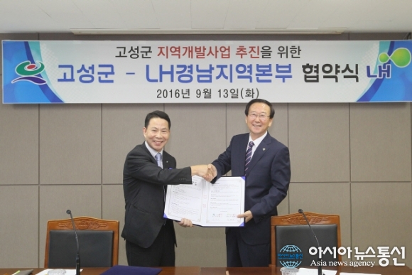 13일 군청 중회의실에서 최평호 경남 고성군수(오른쪽)와 하영배 LH경남지역본부장이 지역개발사업 추진을 위한 기본 협약(MOU)을 체결하고 기념촬영을 하고 있다.(사진제공=고성군청) 경남 고성군과 LH경남지역본부가 급변하는 산업 변화에 대응하기 위해... 2016-09-13