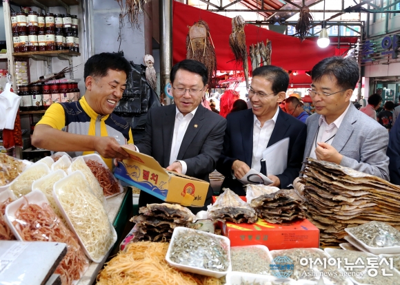 13일 천홍욱 관세청장(왼쪽에서 두번쨰)이 추석을 앞두고 대전 역전시장을 방문해 성수품 유통동향을 점검하고 상인대표와 함께 이야기를 나누고 있다.이날 시장에서 구입한 과일, 떡과 생필품, 위문성금으로 대전시 대덕구 ‘성우보육원’을 찾았다.(사진제공=관... 2016-09-13