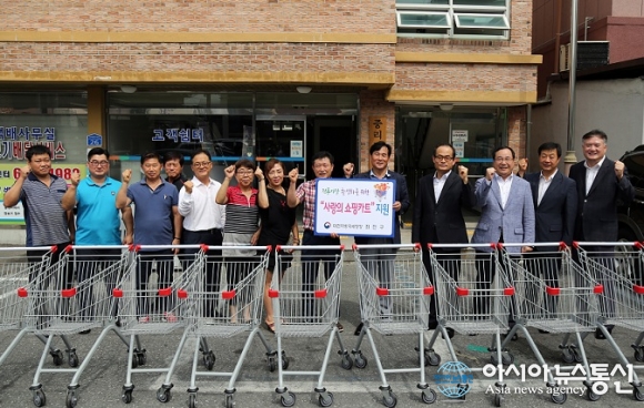 12일 최진구 대전지방국세청장(오른쪽 다섯번째)을 비롯한 직원들이 중리시장을 방문해 '사랑의 쇼핑카트'를 중리시장상인회에 기증했다.(사진제공=대전지방국세청) 대전지방국세청이 12일 추석 명절을 맞아 직원 100여명이 중리전통시장을 방문해 ‘... 2016-09-13