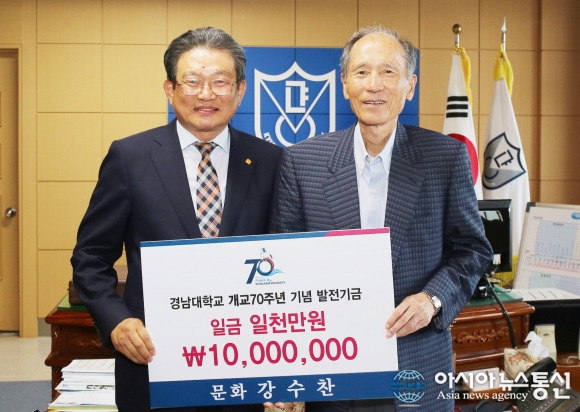 13일 오후 경남대학교 총장실에서 문화 강수찬 대표(왼쪽)가 박재규 총장에게 개교 70주년 기념 발전기금 1000만원을 전달한 후 증서를 들어 보이고 있다.(사진제공=경남대) 경남대학교(총장 박재규)는 13일 오후 2시30분 총장실에서 문화 강수찬 대표로부터 ... 2016-09-13
