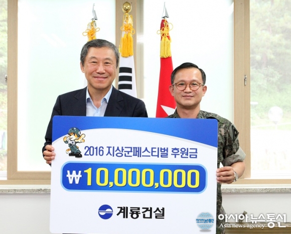 12일 한승구 계룡그룹 부회장(왼쪽)이 이한기 지상군 페스티벌 행사기획단장(오른쪽)에게 후원금 1000만원을 전달했다.(사진제공=계룡건설) 계룡건설이 오는 10월 계룡대에서 열리는 지상군 페스티벌의 성공적 개최를 위해 12일 후원금 1000만원을 전달했다.... 2016-09-13