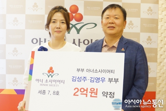 세종시 최초로 부부 아너소사이어티가 된 김성주(오른쪽) 김영우 부부.(사진제공=사회복지공동모금회) 세종시 최초로 부부 아너소사이어티가 탄생했다. 세종시 7번째 아너소사이어티 회원인 김성주 오토피아(주) 대표와 8번째 아너소사이어티로 가입... 2016-09-13