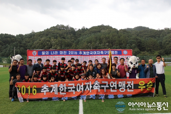 포항여자전자고 축구부가 강원도 화천에서 개최된 '2016 추계 한국여자축구연맹전'에서 우승한 뒤 파이팅을 하며 단체사진을 찍고 있다.(사진제공=포항시청) 경북 포항여자전자고등학교(교장 구항회) 축구부는 지난 2일부터 10일까지 강원도 화천에서 개... 2016-09-13