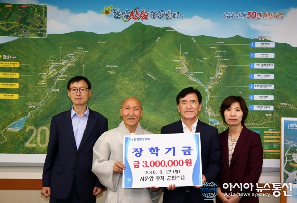 12일 서운암 주지 순민스님이 (사)함양군장학회에 장학금을 기탁하고 있다.(사진제공=함양군청) 경남 함양군 서상면 서운암 주지 순민스님(67)은 12일 (사)함양군장학회에 장학금 300만원을 기탁했다. 순민스님은 지난 2014년부터 3년째 기초연금을 모아 장... 2016-09-13