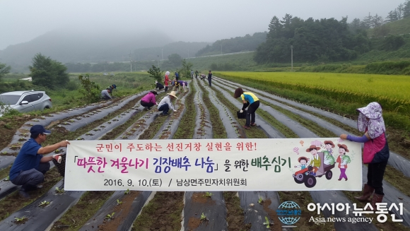 10일 거창군 남상면 주민자치위원 등 주민들이 참여한 가운데 ‘따뜻한 겨울나기 김장배추 나눔’ 행사를 위해 배추를 심고 있다.(사진제공=거창군청) 경남 거창군 남상면은 주민자치위원와 이장, 동령마을 주민 등 50여명이 참여한 가운데 ‘따... 2016-09-13