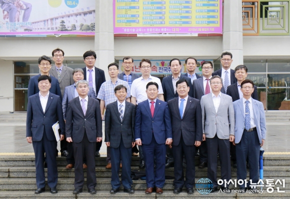 12일 오전 한국폴리텍Ⅶ대학 창원캠퍼스 본관 앞에서 박태원 금형디자인과 학과장(앞줄 왼쪽부터)과 김현필 교무기획처장, 원종식 대학발전위원회 위원장, 김규환 국회의원, 박희옥 한국폴리텍Ⅶ대학장, 장수룡 행정처장, 김기주 학생처장 등이 기념촬영을 하고 있다.(... 2016-09-12