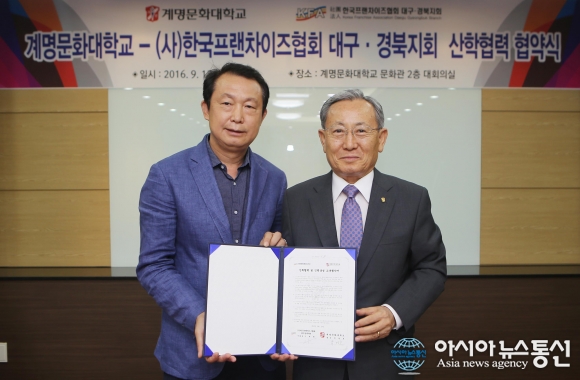 12일 계명문화대 본관 2층 대회의실에서 박명호 총장(오른쪽)과 이재백 (사)한국프랜차이즈협회 대구.경북지회장(왼쪽)이 MOU를 체결한 후 기념촬영을 하고 있다.(사진제공=계명문화대) 계명문화대학교(총장 박명호)는 12일 본관 2층 대회의실에서 프랜차이... 2016-09-12