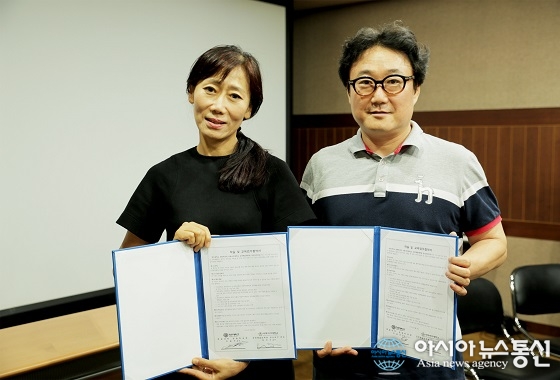 지난 10일 충북 청주대학교 영화학과 어일선 학과장(오른쪽)이 이화여대 공연예술대학원 영상음악전공 최유리 교수와 협약을 체결한 뒤 기념촬영하고 있다.(사진제공=청주대학교) 충북 청주대학교(총장 정성봉) 예술대학 영화학과와 이화여자대학교 공... 2016-09-12