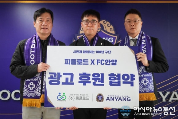 (사진제공=FC안양) [아시아뉴스통신=이상진 기자] 프로축구 K리그1 FC안양이 ㈜피플로드와 광고 후원 협약을 체결했다. 지난 9일 안양종합운동장 귀빈실에서 FC안양과 ㈜피플로드의 광고 후원 협약식이 진행됐다. 이번 협약식에는 FC안양 이우형 단장, ㈜피플로드 김남균 대표 등 양사 관계... 2026-04-15