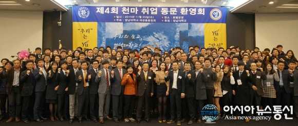 25일 서울 삼정호텔에서 열린 영남대 재경총동창회 '제4회 천마 취업동문 환영회'에서 영남대 선후배 동문들이 기념촬영을 하고 있다.(사진제공=영남대) 대한민국을 이끌고 있는 영남대 출신의 파워 리더들이 후배들을 격려하기 위해 한자리에 ... 2015-11-26