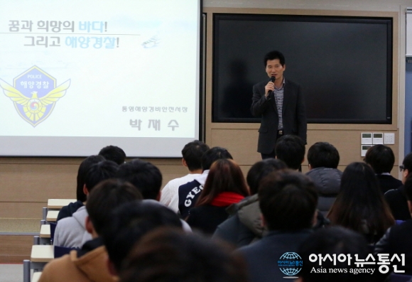 25일 경상대학교 해양과학대학교에서 박재수 통영해양경비안전서장이 해양경찰학과 학생들을 대상으로 특강을 하고 있다.(사진제공=통영해양경비안전서) 경남 통영해양경비안전서 박재수 서장이 25일 경상대학교 해양과학대학교에서 해양경찰학과 ... 2015-11-26