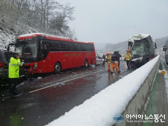 26일 오전 9시 6분쯤 충남 공주시 의당면 정안 IC에서 세종방향 15㎞ 지점에서 광광버스와 승용차 등 11대 차량이 눈길로 인해 추돌하는 사고가 발생했다.(사진제공= 공주소방서) 26일 오전 9시 6분쯤 충남 공주시 의당면 정안 IC에서 세종방향 15㎞ 지점에서... 2015-11-26