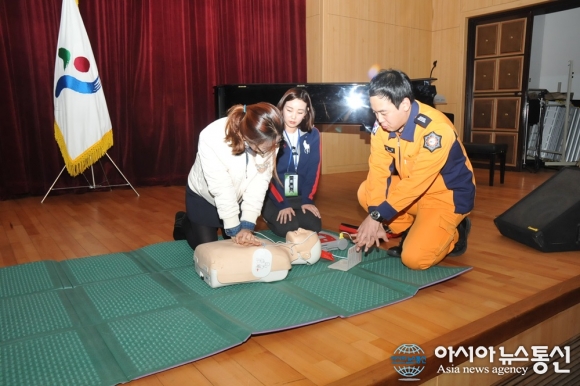 25일 서초소방서(서장 권혁민)는 서울시 인재개발원에서 8·9급 신임공무원들을 대상으로 심폐소생술교육을 실시했다. 흉부압박시 손의 모양을 설명해주는 소방관.(사진제공=서초소방서) 서초소방서(서장 권혁민)는 25일 서울시 인재개발원에서 8&middo... 2015-11-26