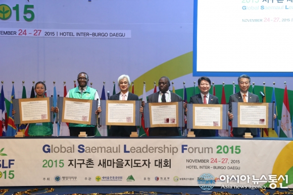 25일 지구촌 새마을 지도자 대회에서 권영진 대구시장과 정종섭 행정자치부 장관, 새마을 지도자 등이 '2015 대구선언'을 공동 발표한 후 기념촬영을 하고 있다. 왼쪽부터 미얀마 '호타이호타이 루윈', 탄자니아 '카욘보', 필리핀 퀴리노 주지사 ... 2015-11-25