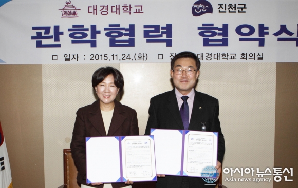 24일 대경대 회의실에서 이채영 총장(왼쪽)과 전원권 진천군수권한대행(오른쪽)이 국제학교 설립 및 폭 넓은 관.학 교육사업을 위해 산학협력을 체결한 후 기념촬영을 하고 있다.(사진제공=대경대학교) 대경대학교(총장 이채영)와 진천군(군수권한대행... 2015-11-25