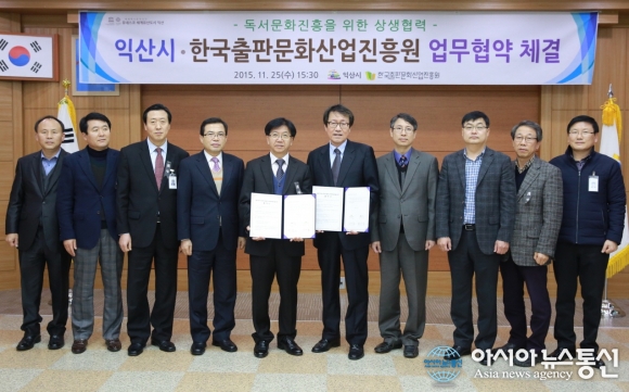 25일 전북 익산시청과 한국출판문화진흥원이 익산시청에서 독서문화 증진을 위한 업무협약을 맺은 뒤, 한웅재(가운데 왼쪽) 익산시장권한대행, 이재호(가운데 오른쪽) 원장 등 양 기관 관계자들이 기념촬영을 하고 있다.(사진제공=익산시청) 전북 익산... 2015-11-25
