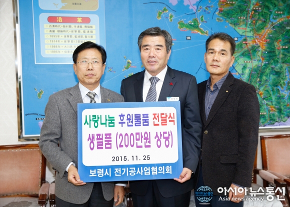 전기공사업 협의회 박인원 충남도 협회장과 박하석 보령시 협회장 등은 25일 김동일 시장에게 다문화와 소외계층에게 전달해 달라며 ‘사랑의 후원물품’을 전달했다.(사진제공= 보령시청) 전기공사업 협의회 박인원 충남도 협회장과 박하석 보... 2015-11-25