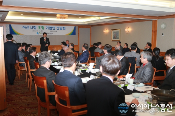 충남 아산시는 24일 (사)아산시기업인협의회 회원사 대표 40여명과 소통간담회를 가졌다.(사진제공=아산시청) 충남 아산시(시장 복기왕)는 24일 온양관광호텔에서 (사)아산시기업인협의회(회장 구연찬) 회원사 대표 40여명과 소통간담회를 가졌다. 이... 2015-11-25