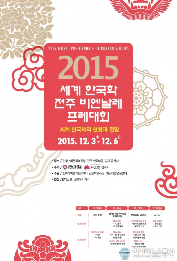 다음달 3일부터 6일까지 전북대학교와 전주시가 전주한옥마을 및 한국소리문화의전당에서 개최하는 세계한국학전주비엔날레 포스터.(자료제공=전북대학교) 한류문화의 확산과 함께 세계로 나아가고 있는 한국학의 현황을 검토하고 앞으로의 방향을 ... 2015-11-25