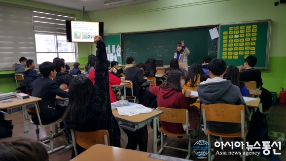 충남 천안북중학교는 2학년 전 학급을 대상으로 24일‘청소년을 위한 금융경제교실’진로특강을 실시했다.(사진제공=천안교육지원청) 충남 천안북중학교(교장 노재거)는 24일 우정공무원교육원의 지원을 받아 2학년 전 학급을 대상으로 진로교... 2015-11-25