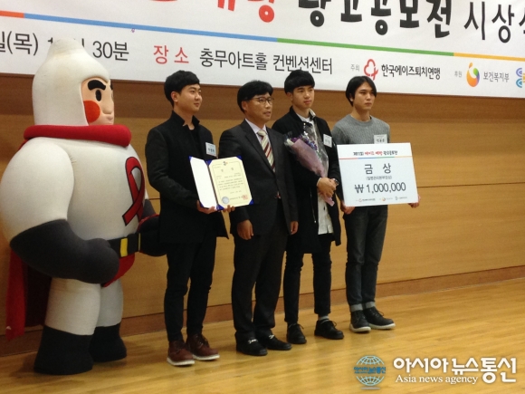 제11회 에이즈 예방 광고공모전에 참여한 선문대학교 시각디자인학과 학생들이 수상 후 기념촬영을 하고 있다. 왼쪽부터 박병혁 학생·박종억 보건복지부 사무관·반가운 학생·정용훈 학생.(사진제공=선문대학교) 선문대학교(총장 황선... 2015-11-25