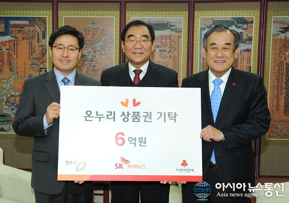 25일 SK하이닉스(청주지원본부장 장종태)가 충북 청주시에 6억원어치 전통시장 상품권을 기탁한 가운데 청주시청 접견실에서 열린 기탁식에서 장 본부장(왼쪽)과 이승훈 시장(가운데), 이명식 충북사회복지공동모금회장이 기념촬영을 했다.(사진제공=청주시청) ... 2015-11-25