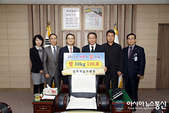 25일 오후 이상수 상주적십자병원장(왼쪽서 세번째)이 이정백 상주시장을 방문해 개원 60주년 기념식때 후원으로 들어온 쌀을 전달하는 피켓을 들고 직원들과 함께 기념사진을 찍고 있다.(사진제공=상주시청) 경북 상주적십자병원(원장 이상수)은 25일 ... 2015-11-25