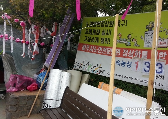 25일 충북 청주시청 정문 앞에서 청주시 노인전문병원노조가 고용승계를 요구하며 천막농성을 벌이고 있다. 청주시는 늦어도 오는 27일부터 새 운영자를 찾는 제3차 공모를 진행할 예정이다./아시아뉴스통신=김영재 기자 충북 청주시노인전문병원의 ... 2015-11-25