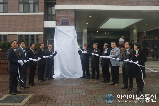 25일 충북대학교는 수의과대학에서 윤여표 총장(왼쪽줄 맨앞), 이승훈 청주시장(왼쪽줄 두번째), 황우석 수암생명공학연구원 책임연구원(오른쪽줄 세번째) 등이 참석한 가운데 줄기세포·재생의학연구소 현판식을 가졌다.(사진제공=충북대학교) ... 2015-11-25
