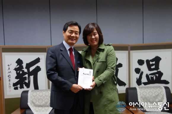 송용길 대전평생교육진흥원장(왼쪽)이 25일 마기영 수필가와 함께 기념촬영을 하고 있다. 마 씨는 대전시민대학에서 ‘창작세상 수필쓰기–여행인생, 예술인생’을 수강하는 학습자로 계간지 ‘시에’의 겨울호에 수필가로 등단했다.(사진제공=대전평... 2015-11-25