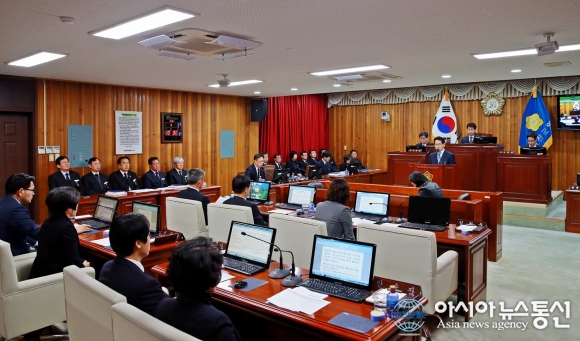 25일 임광원 울진군수가 '제209회 2차 정례회'가 열린 울진군의회 본회의장에서 6363억원 규모의 '2016년도 예산안'을 제출한 후 시정연설을 하고 있다./아시아뉴스통신=남효선 기자 경북 울진군(군수 임광원)이 25일 2016년도 예산안으로 6363... 2015-11-25