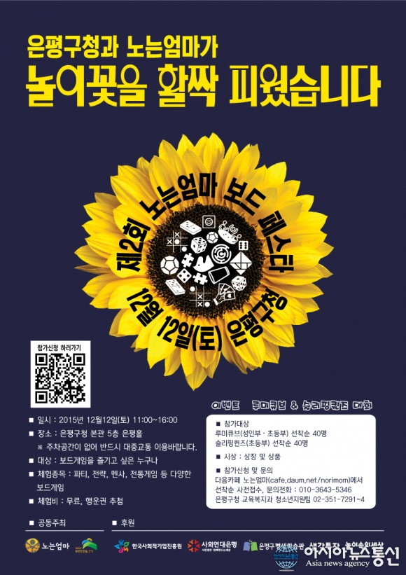 제2회 노는엄마 보드 페스타 포스터.(사진제공=은평구청) 서울 은평구(구청장 김우영)가 다음달 12일 오전 11시부터 오후 4시까지 은평구청 본관 5층 은평홀에서 '제2회 노는엄마 보드 페스타'를 개최한다. 은평구와 다음카페 노는엄마의 공동주... 2015-11-25