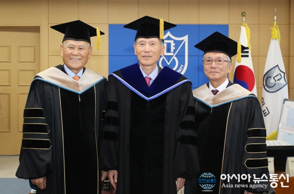 25일 오전 경남대학교 본관 대회의실에서 박재규 총장이 한장규 환웅그룹 회장(왼쪽)과 후치가미 마사토 타카토리복지회 이사장에게 명예 경영학박사학위를 수여한 후 기념사진을 촬영하고 있다.(사진제공=경남대) 경남대학교(총장 박재규)는 25일 오... 2015-11-25