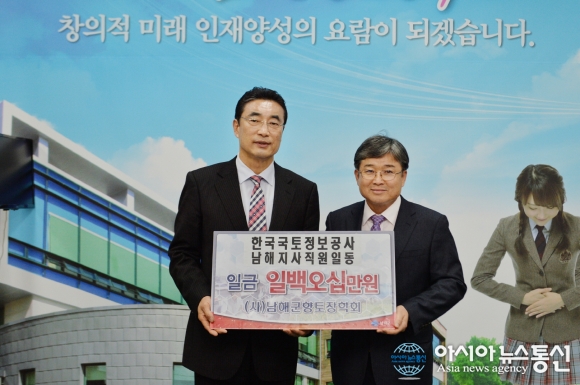 23일 한국국토정보공사 임창옥 남해지사장(오른쪽)이 남해군청 군수실을 방문, 인재육성을 위해 써달라며 장학금을 박영일 군수에게 전달하고 있다.(사진제공=남해군청) 한국국토정보공사 임창옥 남해지사장이 지난 23일 지역 인재육성을 위해 써달라... 2015-11-25