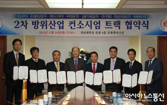 24일 오후 경남대학교 본관 4층 국제회의실에서 경남지역 방위산업 중견기업 7곳과 경남대가 ‘2차 방위산업 컨소시엄 트랙(Track)협약’을 체결한 후 박재규 총장과 기업체 대표들이 협약서를 들어 보이고 있다.(사진제공=경남대) 경남대학교가 ... 2015-11-25