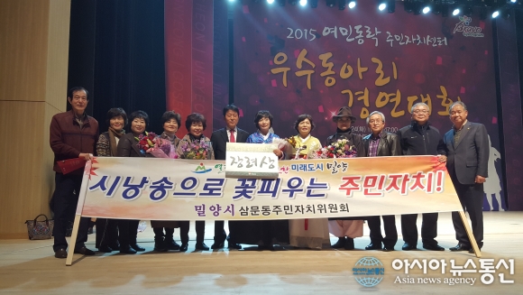장려상 수상한 뒤 기념촬영 모습.(사진제공=밀양시청) 경남 밀양시 삼문동주민자치센터 시 낭송반이 24일 진주시 경남문화예술회관에서 열린 '2015년 경남 주민자치센터 우수동아리 경연대회'에 참가해 장려상을 수상했다. 이번 대회는 경남 ... 2015-11-25