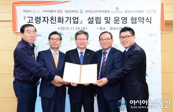 5일 경기 화성시청에서 노인 일자리사업 노노카페 전국화를 위해 화성시가 기아자동차 등 4개 기관과 MOU를 체결하고 있다.(사진 왼쪽부터 박광식 기아자동차 화성공장장, 박용주 한국노인인력개발원장, 채인석 화성시장, 윤신일 강남대학교총장, 김대호 화성시니어클... 2015-11-25