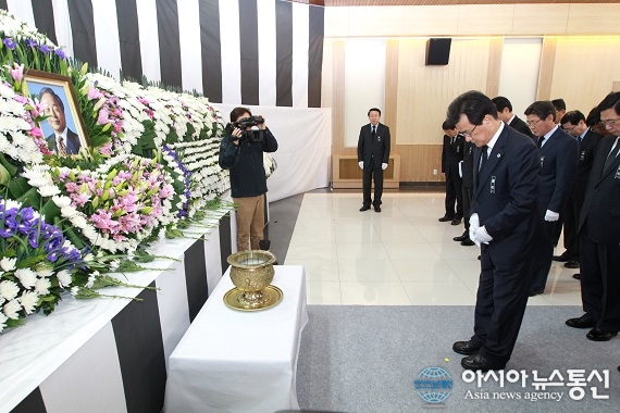 23일 오전 이시종 충북도지사가 실.국장들과 함께 충북도청 대회의실에 마련된 김영삼 전 대통령 합동분향소에서 조문하고 있다./아시아뉴스통신DB 충북지역에 설치된 고(故) 김영삼 전 대통령 합동분향소에 이틀간 2500여명이 조문한 것으로 집계됐다.... 2015-11-25